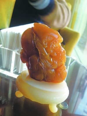 记者注意到,这块田黄石的大小恰好能放在手心里,在上世纪80年代,陈真云的父亲花了数百元,请来雕刻师林东将这块石头精雕细琢几个月,才变成了现在的模样。石头被雕上了济公戏犬的图案,无论是人物的发丝还是小狗的毛,都雕得活灵活现。更令人称奇的是环绕在济公脖子上的那一圈佛珠,一颗颗比芝麻还要小的珠子圆润剔透。石头摸上去仿佛手指尖已经触碰到了婴儿的肌肤,细腻而又光滑。仔细观察下,记者发现石头有些半透明的感觉,就像是凝固的肉冻。