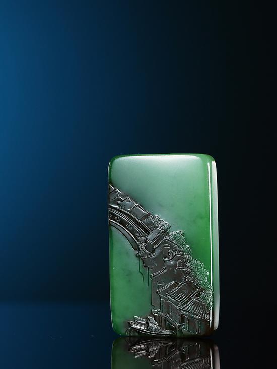 此牌由俄罗斯碧玉雕就,具翠绿、黄褐及黑褐三色,作者将其整体设计为江南一景,画面构图由远及近,疏朗有致,画韵十足,是一件富有设计感的原创小品。