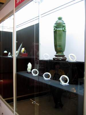 首先就是红姐姐,身材娇小,有点点像南方的女孩子,大大的眼睛,脸上总是笑笑的,说话干脆爽快,特别亲切。4月30日下午她就在展会现场准备了,5月1日又给来参观的顾客们讲解玉器知识、介绍展品,很忙碌,我都不好意思总粘着她问了 红姐姐有点点儿空闲时间,就和我聊天儿,用展品做例子,细心的讲呀讲,怎样看玉的好与不好,怎样看一件玉器的优点,质地、油润、颜色……好多好多的方方面面