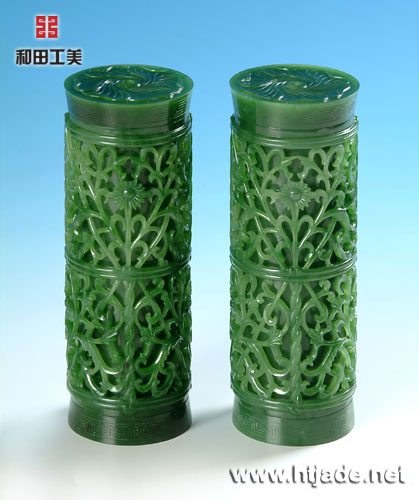 痕玉追求“透”“薄”,以及纯色的玉材雕琢,即一器一色,而图中的碧玉香薰对瓶更始难得的系出同一块玉料,玉质细润有余,色泽更是翠艳直逼翡翠。如此绝美的碧玉配以水磨技术,胎体透薄,内部完全镂空,以精美的花纹图案装饰其表。结合中国工艺的传统方法,创造出带有西番风格的玉器。这些中西结合的玉器直接影响了中国玉器的制作风格,正说明了痕都斯坦风格的影响力。