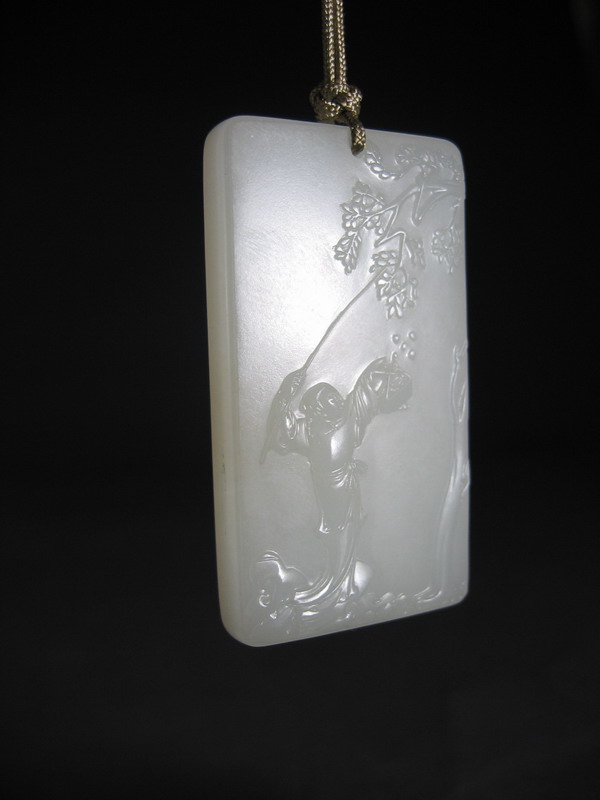 好信息:昨天我去北京古玩诚,正赶上那里的玉府金厅开业,在A178号和田工美--月海轩玉器厅我看到了很多自己喜爱的玉件宝贝,其中有一件是刘忠荣先生的玉牌--"采桑女",漂亮呀!让我感慨万千.幸喜之余,却没能力拿下,"(不好意思,兜里大米太少),还好,跟店主商量后,讨的一张照片,回来自我欣赏.喜爱之余,将照片上穿,让喜爱者与我共享.