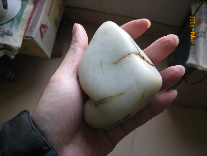 呵呵!!楼上的玉友!你这两块料可不怎么样呀!虽然是地道的和田玉籽料,但却没有工艺价值。我常听这里的行家讲:“籽料不是和田玉的等级标准,它仅仅是一种和田玉的产出形式,是次生矿的一类,”所以不要以为是和田玉籽料都名贵值钱。像你这一类就不能成为有高价值的和田玉艺术品的原料。做奇石观赏或用来压咸菜缸是可以的。(它比一般的石头重)