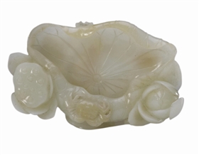 如图所示是北京故宫博物院收藏的一件清代青玉全莲荷叶洗。整器构思巧妙,造型端庄,一片硕大的荷叶,其边缘向上翻卷呈现洗状,外侧凸雕螃蟹,栩栩如生,生动灵气,浮雕有莲花和莲蓬各一枚,扎一束荷叶梗作为笔洗的底部,显得坚实沉稳。笔洗玉质为青白色,局部有褐色沁,晶莹温润,设计生动有趣,雕工精湛细腻,虚实结合,繁简得当,雕工与艺术达到了完美统一。