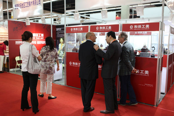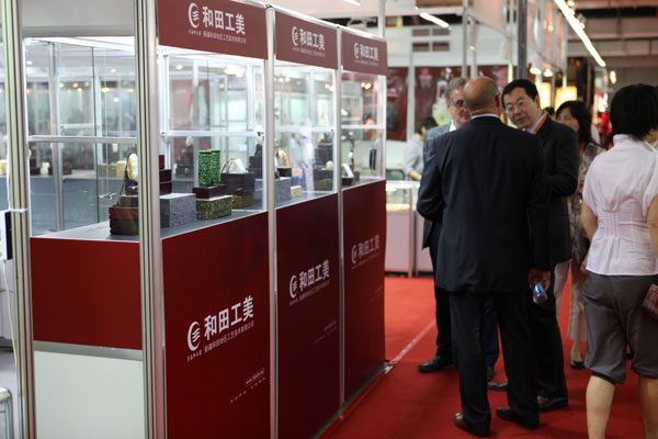 展会现场和田工美的精美玉雕作品受到国际友人的高度赞扬