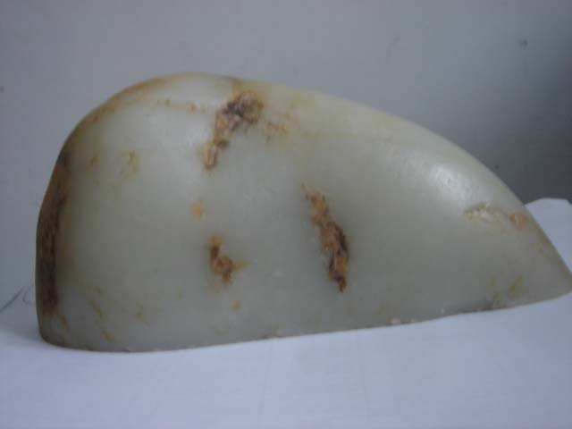 看到一个籽料,很是喜爱,就收了,请高手评议,此料重3.5公斤,实物比照油润,白点.