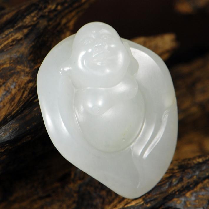色白,玉质纯净,温润而泽,内部偶见极细的小黑点,特写式笑佛面容,圆额秃顶,大耳下垂,开心而笑,玉件挂玉颈前,也会被之感染,笑口常开,笑面人生