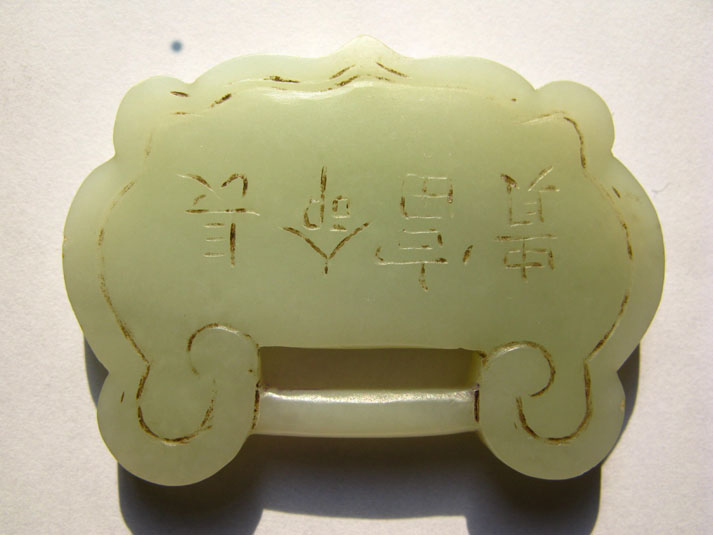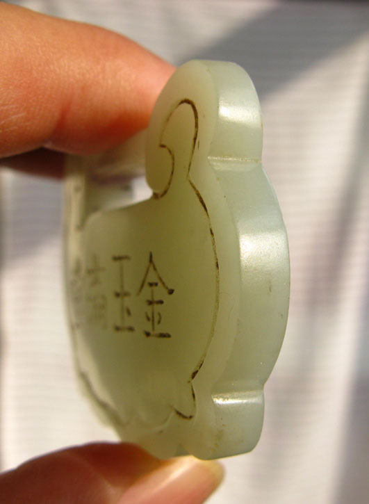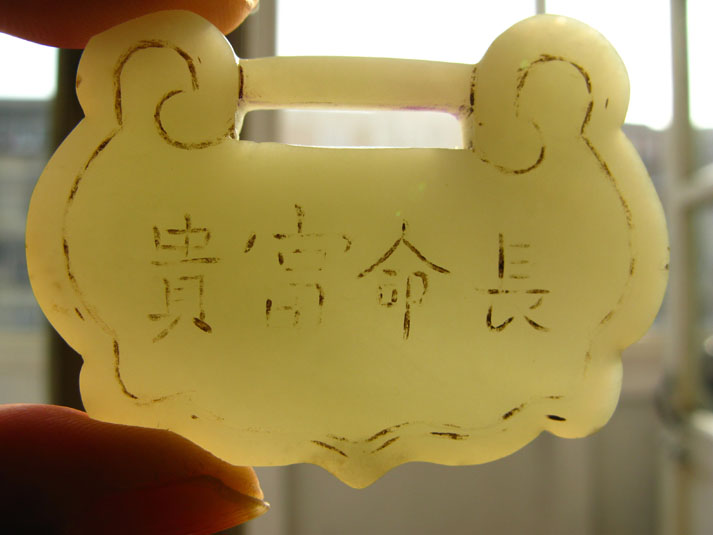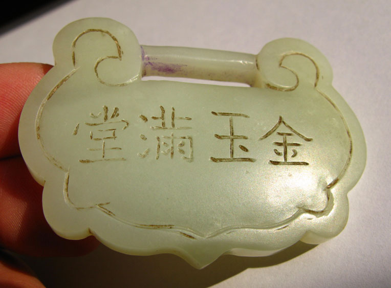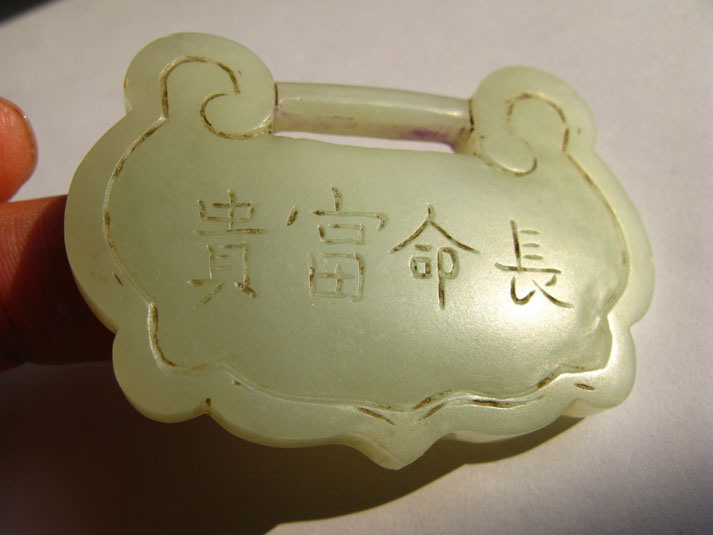 谢谢各位专集的鉴别!第4张逆光照片上的3个绿点是镜头反光造成的,玉锁本身没有绿点。是自然光拍照的,没有任何PS,第3张照片颜色和实物最接近。