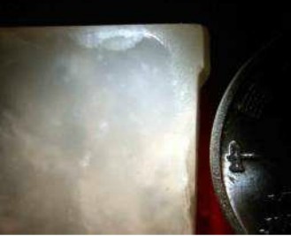 青海料:一是“干”无油润度,但玉友要当心有的商人把青海料沁入油中,时间一久丑态毕露;二是“白”;三是“透” 大多呈透明状……青海料更多见疏松的类型,容易上色,不好打磨,容易出橘皮,容易黯淡。青海料颗粒状结构为主,颗粒中大。颗粒状结构分布均匀,所以相对较透,不具有云絮状的交织结构,里面往往会有孤立的大颗粒白棉(直径2毫米左右)。抛光后表面易产生突起点。手感较干涩,除非抛玻璃光,否则表面是以一系列的颗粒断面组成,所以较干涩。