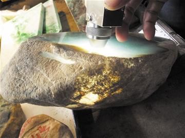储先生给记者讲了他的两次赌石经历,一次失手、一次大胜。在讲述之前,他给记者先补了一课。赌石是滇缅边境一带流行的一种独特的高档翡翠原石交易方式,是指翡翠在开采出来时,有一层风化皮包裹着,无法知道内部的优劣,须切割后方能知道翡翠的质量。