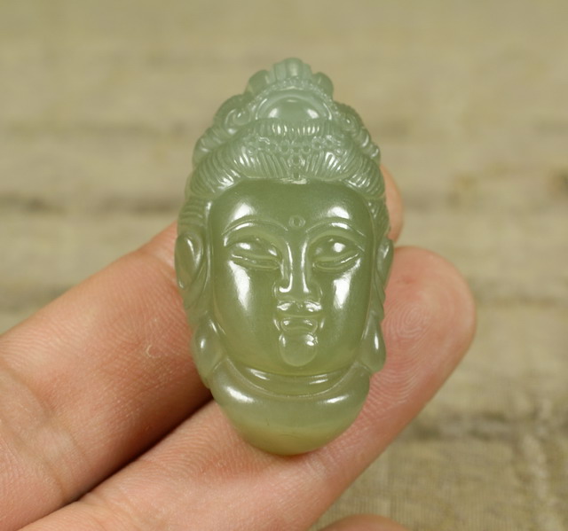 工艺挺好的,面容丰润,肃穆祥和,色虽淡了点,到还悦目,如果是青玉,价格到不高,额头顶那点,是蜡还是花(裂)~~~