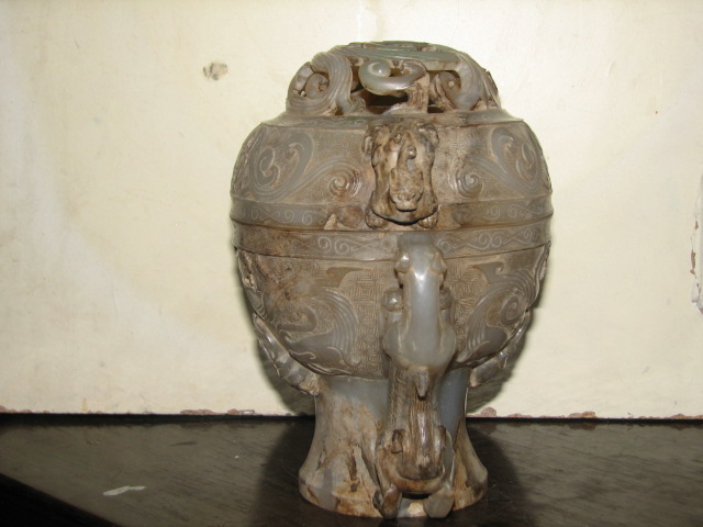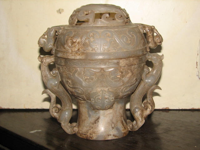 沁色在玉里.我花10000元买的,如果是新的值吗?它的雕工非常好.里面是空的,部分被钙化了,玉质象和田玉.钙化部分里外都一样.如果是旧的,请问版主应该是什么候的?谢谢!