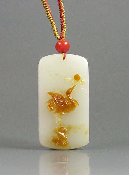 和田玉籽料方牌。以上等大块和田玉籽料切牌琢之,玉质缜密细腻,白度上等,脂性温厚,玉性纯美。浓聚的金皮与白净的肉质交相辉映。工艺师利用金皮巧雕一只仙鹤,单腿直立,展翅欲飞,欲与天公试比高,有意境,有气势。作品料、工、意俱佳,是收藏之珍品。(6.6*3.5*1.0cm 55g)