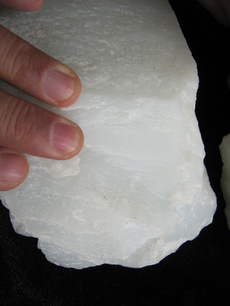到达地方后,连续找了两三天,就是发现不了矿苗,疲惫不堪的矿主躺倒在一堵飘伸出来的山崖下休息,准备打道回府,正在他心灰意冷百无聊赖之际,抬头忽见崖上积雪下,冒出一片白晶晶的石料,他跃上崖顶,发现那竟是百寻不见的羊脂玉料.