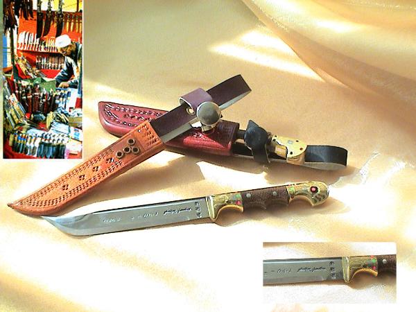 英吉沙小刀是维吾尔族的传统手工艺品,造型别致,制作精巧,既可作刀具,又有艺术欣赏价值,是颇具特色的丝绸之路旅游纪念品。英吉沙小刀多数为弯刀,刀把有木质的、角质的、铜质的、银质的,非常讲究。无论哪一种刀把,英吉沙的工匠们都要在上面镶嵌上色彩鲜明的图案花纹,有的甚至用宝石来点缀,玲珑华贵,令人爱不释手。除英吉沙的小刀外,库车的“孔雀刀”也已远近闻名。少数民族男子都有佩带小刀的习俗,身边能有一把华丽别致的小刀,便平添一种风度。