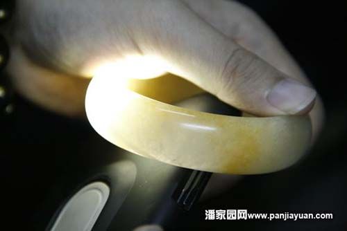 照片中的手镯就是一件“C货”,即经过注胶染色处理后的翡翠商品。乍一看还是挺好看的,但是上手后感觉分量不够足。在灯光下,可以看到染色的痕迹沿裂隙分布,同时还可看到注胶的老化痕迹。