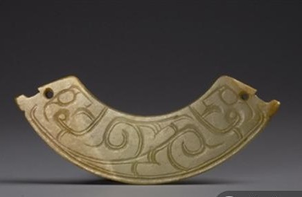 注解:东汉和田白玉双龙首纹璜,主体为双龙首合身璜形。玉质温润,白而细腻,琢工细致精妙,纹饰大气俊美,是典型的东汉龙!