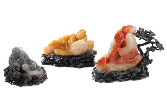 圆雕人物当中的经典作品常常成为收藏爱好者们竞相追捧的作品,在前几届的福建东南拍卖有限公司艺术品拍卖会上,就有几件给广大寿山石收藏爱好者留下深刻印象。如中国工艺美术大师郭懋介雕刻的笑狮罗汉、儒释道人物等作品分别在2012年秋拍和近年春拍取得不俗的成交纪录;另一位中国工艺美术大师的作品善伯洞石圆雕观音坐像也曾是2012年秋拍藏家争夺的焦点。今秋两位大师也有精彩的寿山石圆雕人物上拍,其中善伯洞石三罗汉摆件的作者为郭懋介,荔枝洞石观音像则为王祖光的作品。两位大师的创作都遵循了依石造型的原则,创作即根据石材本身的形状,惜石之情不必言说,已在作品中表达的淋漓尽致。尤其这尊观音像,作者充分考虑到了荔枝洞石本身的稀有性,因此尽量以大写意的手法勾勒山石的轮廓,甚至借用薄意的手法刻画紫竹与烟云,唯其质地最细嫩处刻画自在观音,端庄、温婉、娴雅的姿态充分展现出雕刻家精深的技艺。在山石的素白处,作者墨刻“观自在菩萨”、“祖光敬刻”等题款,以示敬意。王祖光被业界誉为“观音王”,言其有恒心,善钻研,此言不虚。(来源:集珍文化 文/旋覆 图/福建东南拍卖)