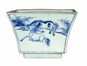 这件青花八骏图方形花盆(见图),为清代雍正年间烧制,高9.5厘米,口径12厘米,足径7厘米。四边方形。敞口,平肩。四边上宽下窄,呈弧形下收,下方有内缩四方圈足,使花盆平稳踏实。盆中施白釉,盆底有孔,显然是作为浇花漏水之用。平肩没有纹饰,四面的腹壁分别用线条圈成正方形,圈中各绘两匹骏马,四面组合起来,就是一幅完整的八骏图图案。盆底部有款:“雍正二年黄菊圃置”。