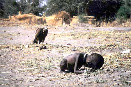 那是一个苏丹女童,即将饿的死跪倒在地,而兀鹰正在女孩後方不远处,虎视眈眈,等候猎食女孩的画面。