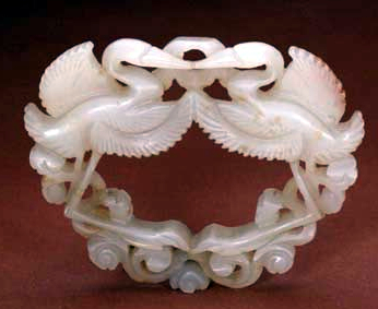 质似白玉,微带青色,鹤头相对,双鹤翅爪相接,作展翅欲飞状。上部有孔备穿系,知是佩饰。 这件寓意祥瑞的双鹤佩的制作,受道教影响,并反映出宋代道教的发展。宋代道教影响的扩大同某些帝王崇尚道教有关。史书记载宋徽宗好道教,并把鹤作为祥瑞之物。玉雕中对称动物布局渊自唐代,但这种双鹤题材却是自宋代逐渐增多的。