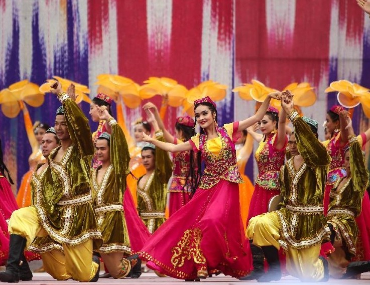8月28日,演员在开幕式上表演舞蹈。当日,第十一届和田玉石文化旅游节在新疆和田市开幕。本届旅游节以“世界玉都、丝路名城”为主题,为期3天。旅游节活动包括开幕式文艺演出、和田玉原石及玉雕作品展销、玉雕大师作品展示等。