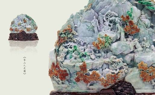 这样大体积、多色彩且质地匀一的翡翠原料本身十分珍贵,三位玉雕国手的精湛技艺更是赋予这件作品不同凡响的艺术价值。香山九老的题材表现了中国传统文人对山水田园风情的无限向往,极富人文气息,堪称是一件具备极高的艺术价值与商业价值的收藏珍品。