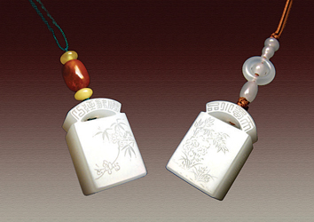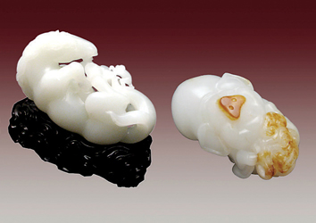 《情魅猪马》组件 沈水富作品 “马上封侯”、“诸事如意”,都属于传统的雕刻题材。而此组作品以上述两者联并形成“青梅竹马”组合,摩玩甄赏,尤觉添兴。双器健马撒欢、憨猪自乐,其中巧色精雕、工致卓绝,透射出浓厚的生活气息。