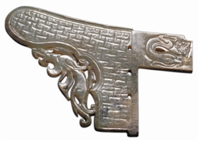 汉以后玉戈不常出现。西汉出廓龙凤纹玉戈,长17.2厘米,宽11厘米,厚0.71厘米,新疆和田白玉,玉戈短援、长胡,胡刃上有一棘刺,阑侧三穿,援及胡部主体饰以浅浮雕的勾连云纹。援、胡之下透雕有一只异常凶猛的螭虎,尾上卷,作奔走状。玉戈主体两面纹样相同,而戈内两面纹样不同。戈内面浅浮雕猛虎,另一面则浅浮雕朱雀纹饰。这件玉戈罕见,刃部未见使用痕迹,当属于玉礼兵器,可能是楚王专门用作祭祀或出行的仪仗用品。