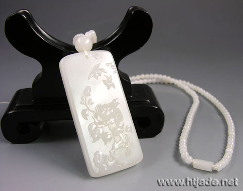 2、展柜里除了摆放着款式繁多的吉祥喜庆玉饰,还有一些寓意多样的玉器挂件。一块雕工精美的和田玉挂件吸引了笔者。该块雕件玉质温润如婴儿的肌肤,主体为鲤鱼戏水。王老板介绍,这叫做以形制形,双彩巧雕,取谐音“贝”、“鱼”,有辈辈有余、代代富裕满足之意。据了解,在中国传统文化艺术中,鱼一般用来作为财富、繁荣、收获的象征,由于鱼儿多产,因而也被看做是多子多孙的象征;也因鱼儿在水中很快乐,它们也是和谐美满的婚姻象征,代表快乐的结合。